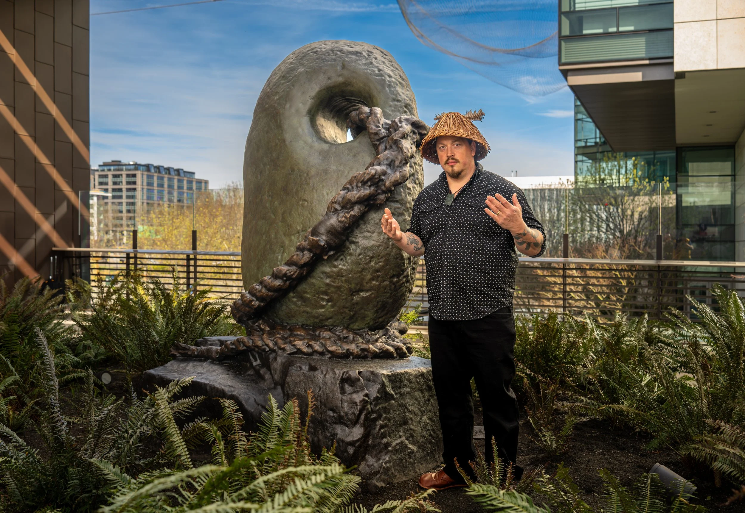 Dan Friday with other tribal members of the Lummi Nation presenting and dedicating the 9 foot tall sxwo'le bronze anchor (tćilen) sculpture (created by Dan), to the Gates Foundation.